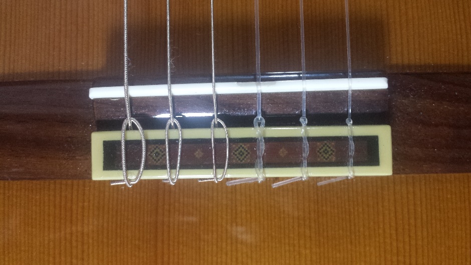 Aquí tenemos un detalle de la tapa armónica, con la boca y el puente a la derecha: